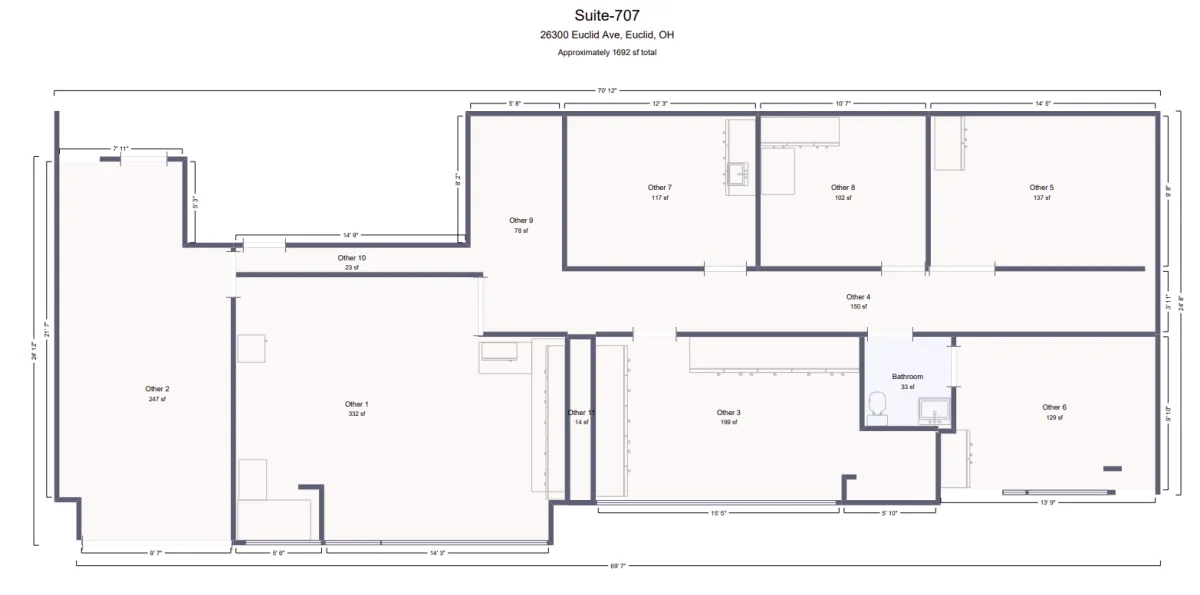 Unit 707 offers 1,692 sq ft of flexible medical space with optimal patient flow design and private consultation areas for HIPAA compliance